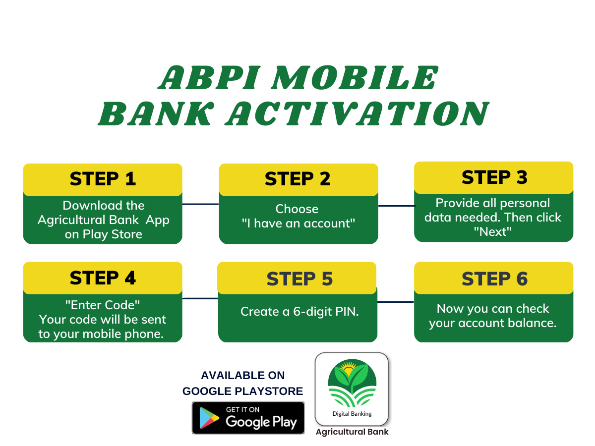 Mobile WelcomeOur Mobile appGet things done wherever you areEnjoy the convenience of loading your prepaid accounts and e-wallets. Mobile App StepsOur Mobile app Slide 1Need Assistance?Contact Us >Help & Support >Find UsBranches >Follow UsAgricultural Bank@phil_agribank@agricultural.bankProud Member of