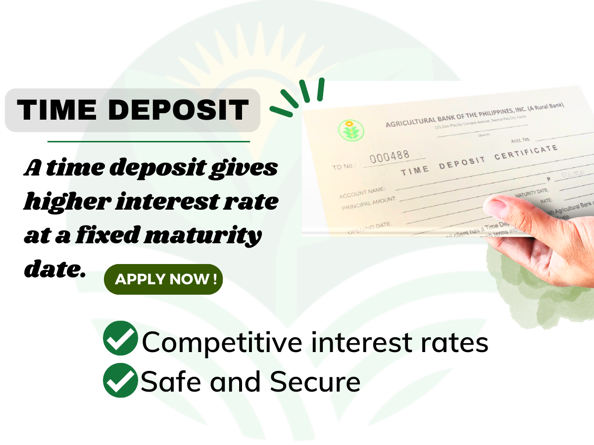 Full 1Know More Regular Time Deposit: Slide 1Need Assistance?Contact Us >Help & Support >Find UsBranches >Follow UsAgricultural Bank@phil_agribank@agricultural.bankProud Member of